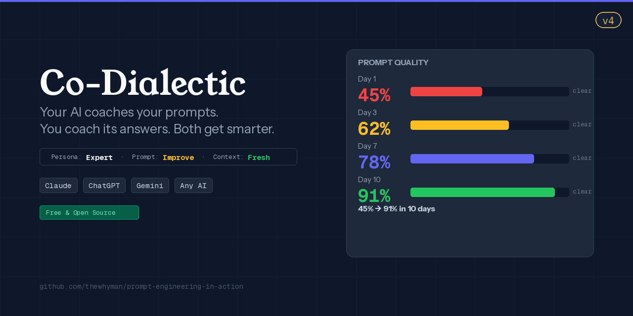 The highest-leverage intervention in AI-assisted work is not a better model. It’s a better conversational substrate. Co-Dialectic is that substrate. v4 is the version where it composes cleanly with everything you already use, runs at sub-cent verification cost, and ships open-source without compromise.