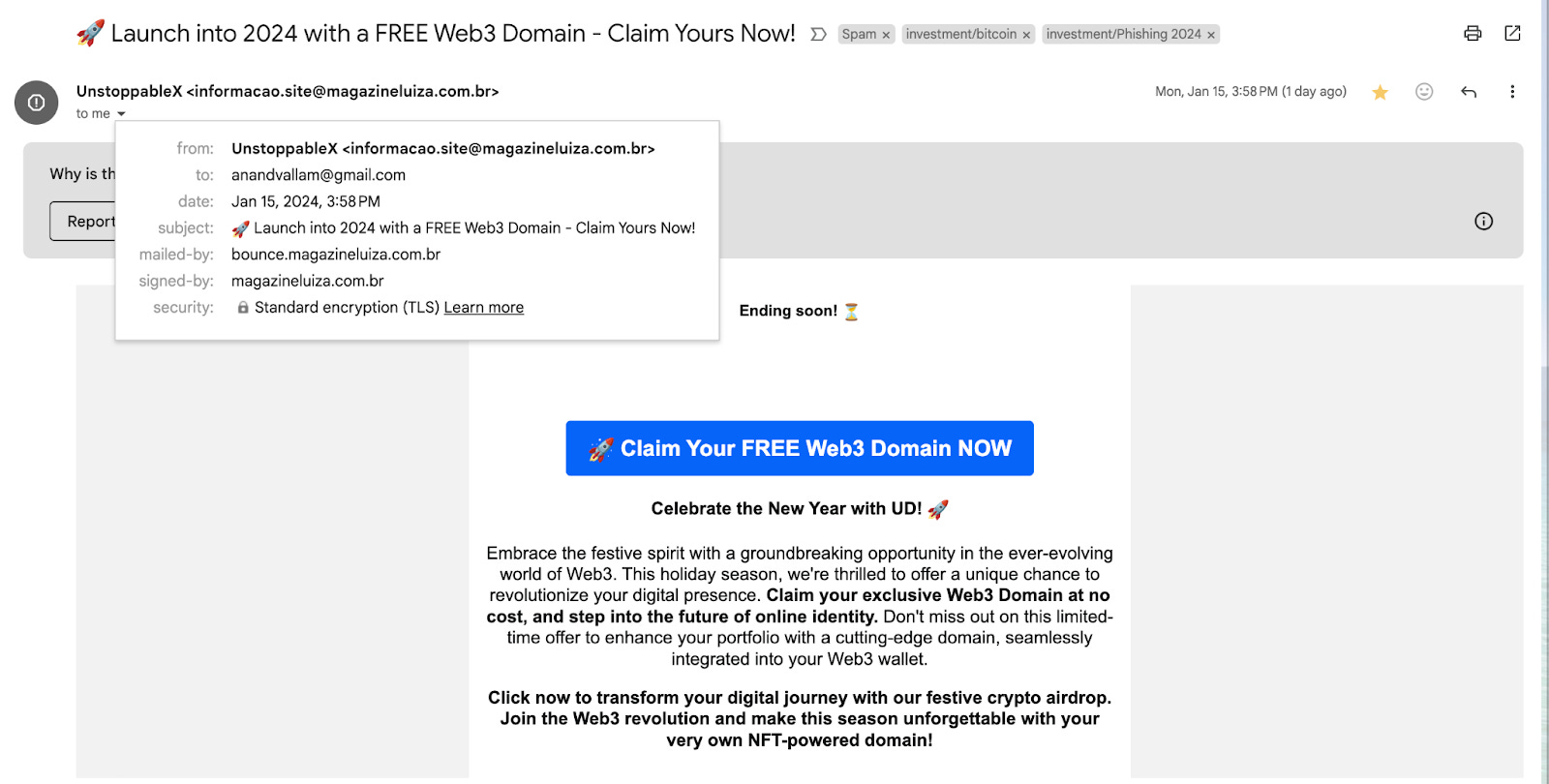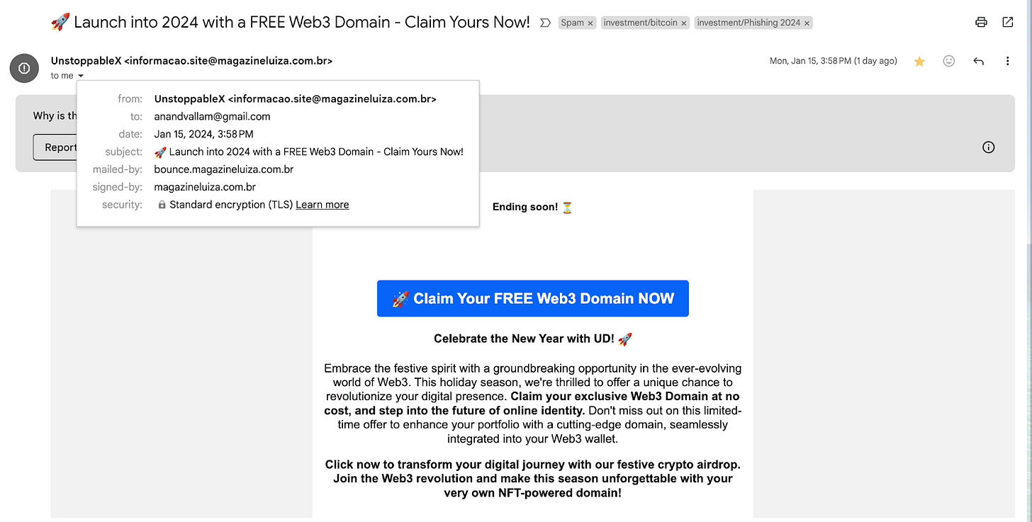 The url shows as unstoppabledomans com, but the actual URL is https://xn--unstoppabledomans-rvb com.