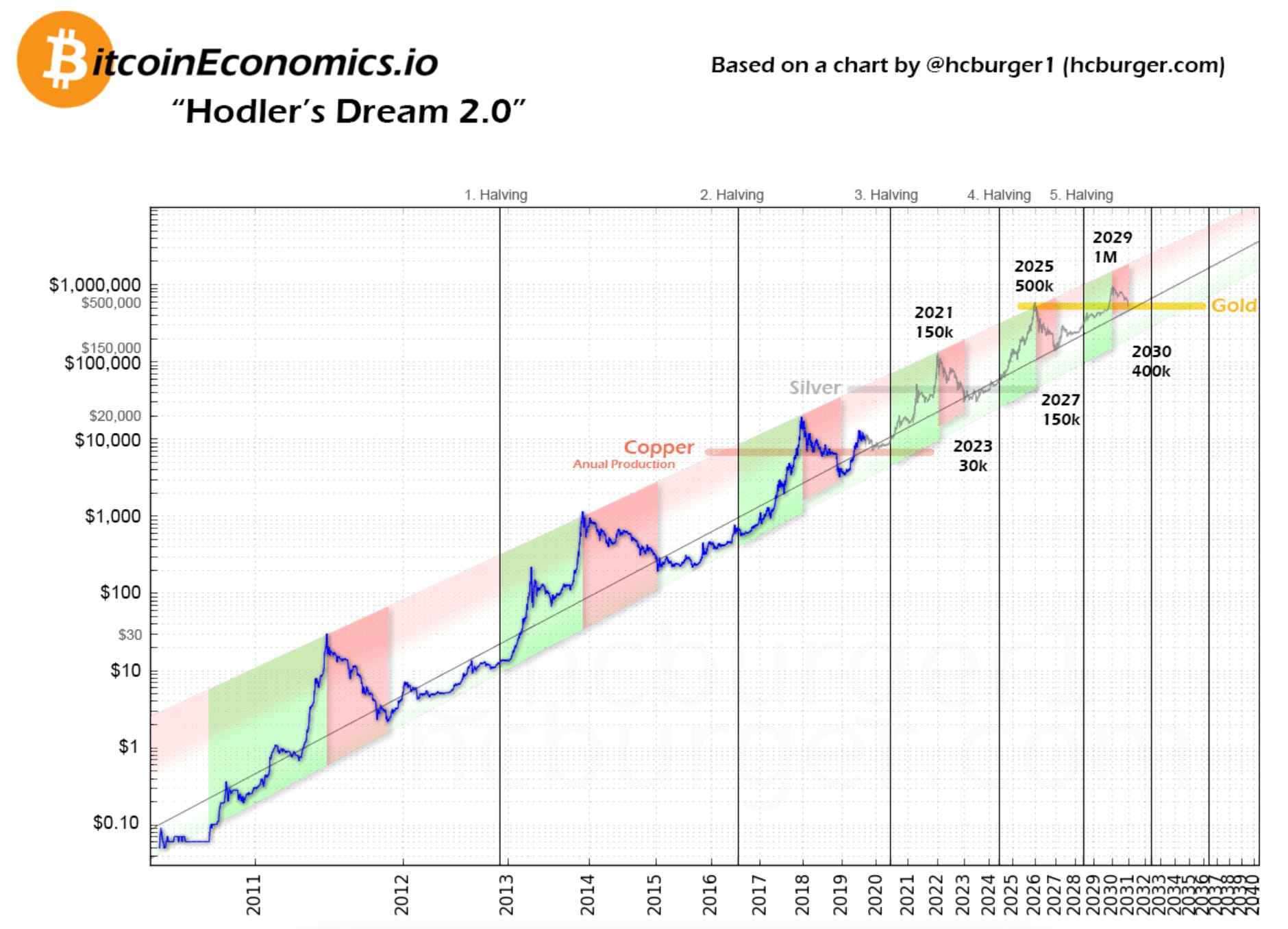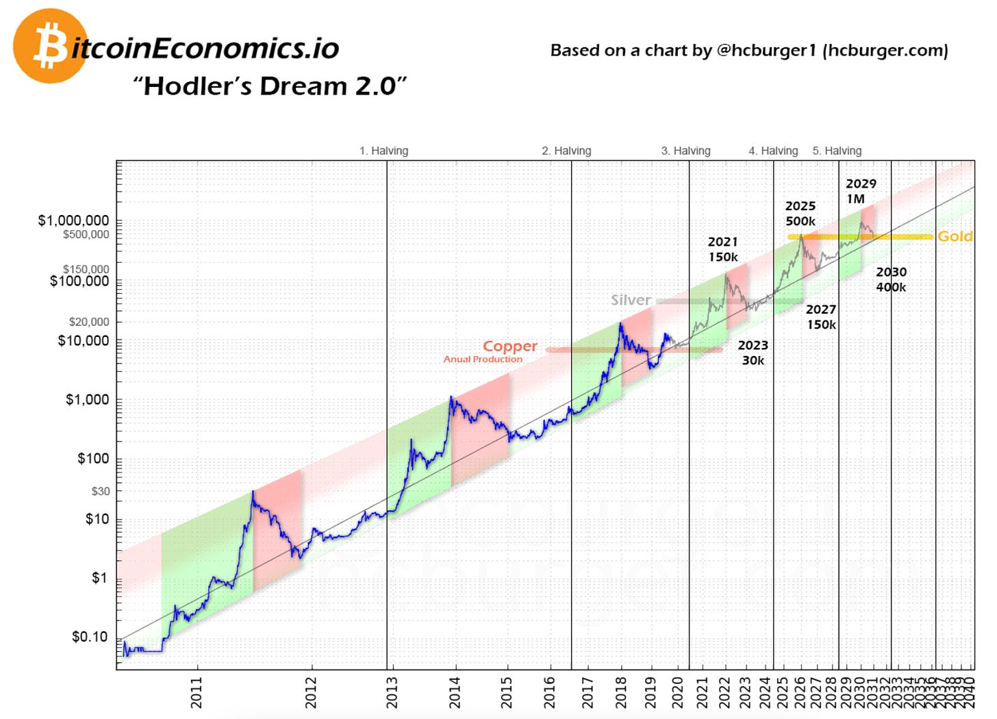 Long term logarithmic price predications based on the past cycles. Past is not an indication of the future, but it can give you clues. Unless something terribly goes wrong (read my Why blog on risks), things will follow the trend.