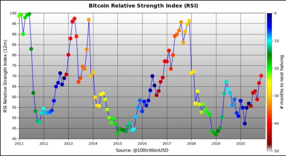 Here is a good view of how the demand/Relative Strength index (RSI) in relation to halving events.